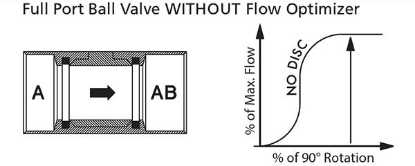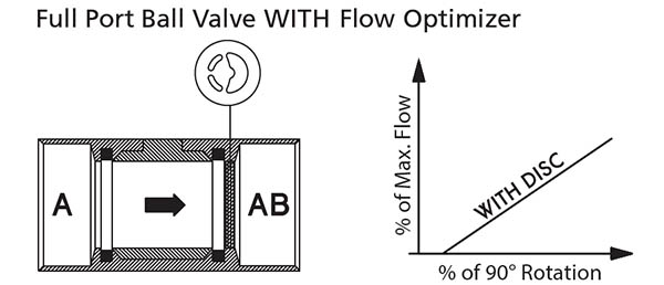 The addition of a parabolic disc to the full port ball valve converts this valve from a standard on/off ball valve to an extremely precise flow control valve for HVAC applications. The disc, or “flow optimizing trim” makes the percentage of maximum flow increase evenly with direct relation to the percentage of the 90° rotation. (More information on the SM Series)